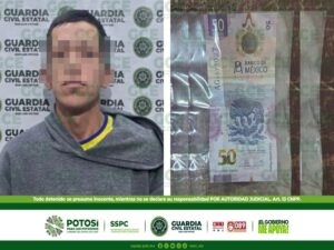 San Luis Potosí, S.L.P.- Patrullajes preventivos, desdoblados por la Guardia Civil Estatal, derivaron en la detención de un hombre, señalado del probable delito de cohecho,