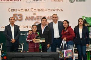 Al encabezar la ceremonia del 53 aniversario del Consejo Nacional de Fomento Educativo, el Gobernador del Estado entregó material de apoyo y el Premio Conafe