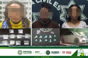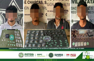 S.L.P.- Acciones preventivas y de seguridad implementadas por la Guardia Civil Estatal, permitieron la detención de tres presuntos narcomenudistas, a quienes se les aseguró 20