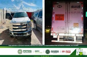 -Las dos unidades recuperadas en la Huasteca estaban blindadas y en su interior había 60 artefactos metálicos conocidos como “poncha llantas”. S.L.P.- Agentes de la