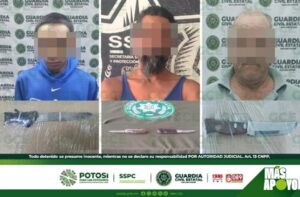San Luis Potosí, S.L.P.- Oficiales de la Guardia Civil Estatal (GCE) detuvieron a tres hombres, en diferentes ubicaciones, por el probable delito de portación de