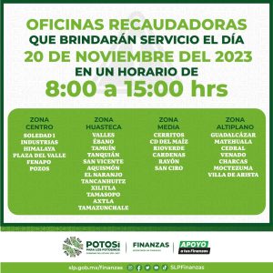 En apoyo a las y los potosinos, la Secretaría de Finanzas (Sefin), mantendrá en operación 31 oficinas recaudadoras en todo el Estado durante el asueto