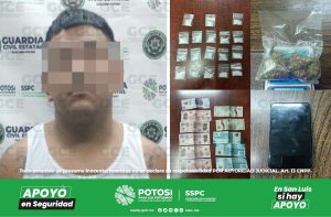 -A los presuntos se les aseguró 32 dosis de “cristal” y 25 dosis de marihuana. San Luis Potosí.- Las constantes labores de la Guardia Civil