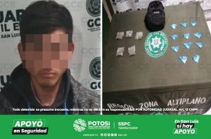 Matehuala, S.L.P.- Oficiales de Guardia Civil Estatal (GCE) detuvieron a presunto vendedor de droga tras asegurarle 16 dosis de diversos estupefacientes, preparados para su venta