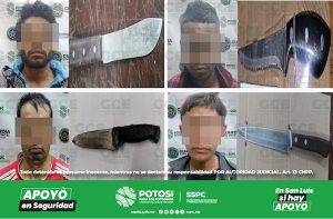 S.L.P.- Elementos de la Guardia Civil Estatal (GCE) detienen a cuatro hombres tras asegurarles armas punzocortantes, los hechos tuvieron lugar en la zona metropolitana y