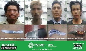 San Luis Potosí, S.L.P.- En distintas acciones operativas, policías de la Guardia Civil Estatal (GCE) detuvieron a cuatro hombres tras asegurarles armas punzocortantes en su