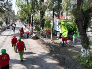 El Alcalde Enrique Galindo dio inicio a los trabajos de remozamiento en la emblemática Calzada de Guadalupe, con cuadrillas de trabajadores municipales. Se realiza limpieza