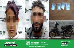 San Luis Potosí, S.L.P.- Dentro de los operativos de prevención y disuasión, elementos de la Guardia Civil Estatal (GCE) detuvieron a una pareja quienes presumiblemente