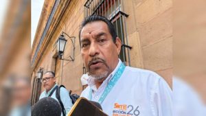 Encabezados por el líder de la Sección 26, Juan Carlos Bárcenas Ramírez, secretarios generales del nivel de Telesecundaria en San Luis Potosí sostienen hoy una