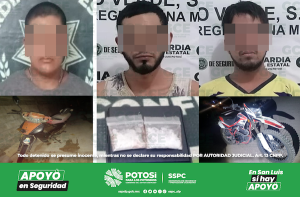 S.L.P.- En el interior del Estado, oficiales de la Guardia Civil Estatal (GCE) detuvieron a tres hombres por presuntos delitos contra la seguridad de tránsito;