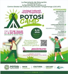 Las Secretarías de Educación del Gobierno del Estado (SEGE), de Cultura (Secult) y parques Tangamanga, realizarán el “Campamento Potosí” para las y los niños de