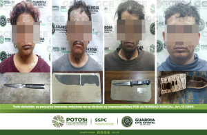 S.L.P.- En diferentes ubicaciones de la zona metropolitana y conurbada, elementos de la Guardia Civil Estatal (GCE) arrestaron a tres hombres y una mujer, tras