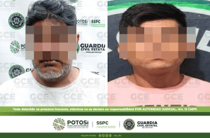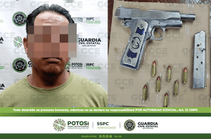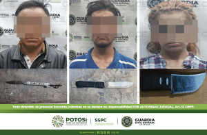 San Luis Potosí, S.L.P.- Oficiales de la Guardia Civil Estatal (GCE) detuvieron a dos hombres y una mujer en la capital potosina, tras asegurarles armas