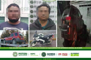 S.L.P.- Agentes de la Guardia Civil Estatal (GCE) localizaron tres vehículos que contaban con reporte de robo, derivado de estos hechos, dos personas resultaron detenidas,