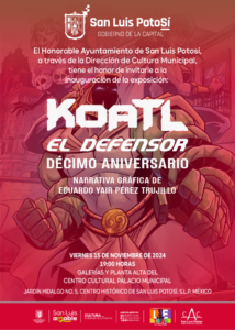 La narrativa de Koatl el Defensor (superhéroe potosino) fusiona mitología prehispánica, ficción histórica y superhéroes desde una perspectiva mexicana. Se inaugura este viernes 15 de noviembre de
