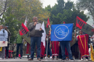 En la Ciudad de México, en la sede de la Secretaría de Gobernación (SEGOB), integrantes del Sindicato Independiente de Trabajadores y Trabajadoras del Gobierno del
