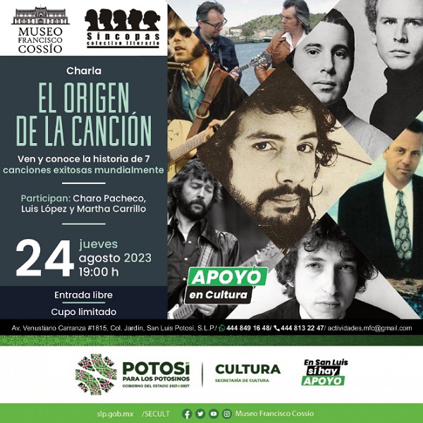 En San Luis Potosí si hay apoyo en cultura, y en este sentido la Secretaría de Cultura de Gobierno del Estado invita al público a participar en la charla “El origen de la canción”, la historia de 7 melodías exitosas a nivel mundial” a cargo del colectivo literario Síncopas, con la participación de Charo Pacheco, Luis López y Martha Carrillo. La cita es este jueves 24 de agosto a las 19:00 h, en las instalaciones del Museo Francisco Cossío, la entrada es libre y el cupo es limitado.