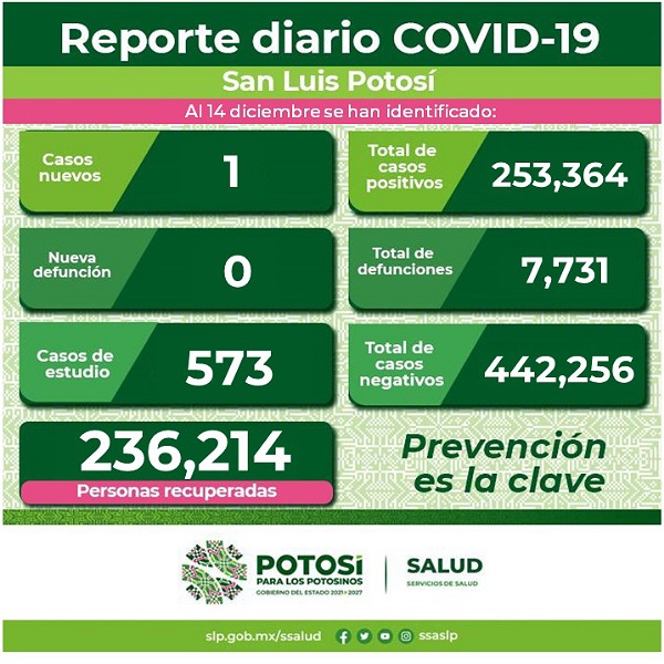 Se suma un caso más de Covid en la entidad, SLP llega a los 253 mil 364 casos.