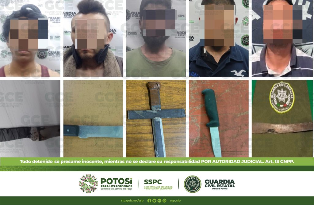 S.L.P.- Mediante los diferentes operativos emitidos por elementos de la Guardia Civil Estatal (GCE), tanto en la capital como en su zona conurbada, cinco hombres resultaron detenidos por el probable delito de portación de armas prohibidas.