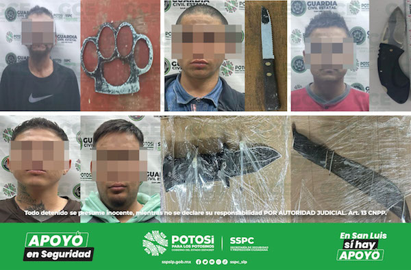 S.L.P.- Recorridos de seguridad efectuados tanto en la capital del estado como en los alrededores y periferias, permitió la detención de cinco presuntos, por parte de la Guardia Civil Estatal (GCE), luego de que se les aseguraran armas prohibidas en su poder.