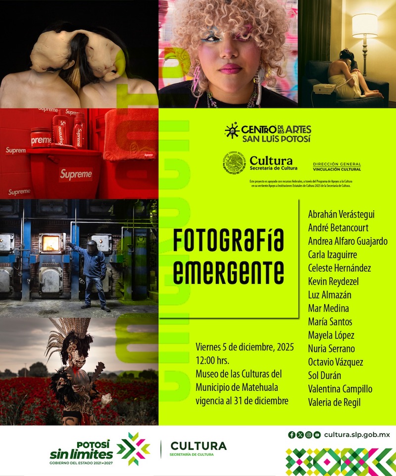 La Secretaría de Cultura de Gobierno del Estado invita al público a disfrutar de la exposición fotográfica “Colectiva Fotografía Emergente”, que se presenta en el Museo de las Culturas del Municipio de Matehuala, misma que reúne el talento de quince artistas como Abrahán Verástegui, André Betancourt, Andrea Alfaro Guajardo, Carla Izaguirre, Sol Durán, Kevin Reydezel, Luz Almazán, María Santos, Mar Medina, Mayela López, Nuria Serrano, Octavio Vázquez, Celeste Hernández, Valeria del Regil y Valentina Campillo.