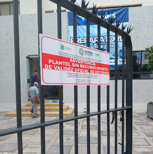 En seguimiento a la visita de vigilancia extraordinaria iniciada por el Poder Ejecutivo a través de la Secretaría de Educación de Gobierno del Estado (SEGE) en contra de la persona moral Universidad Potosina S.C., este jueves fueron colocados sellos de advertencia de que dicho plantel no cuenta con un Reconocimiento de Validez Oficial de Estudios (RVOE), que respaldara legalmente el publicitar e impartir estudios de nivel superior, de las carreras de Licenciatura en Médico General, Licenciatura en Gastronomía, Licenciatura en Estomatología y Licenciatura en Psicología.
