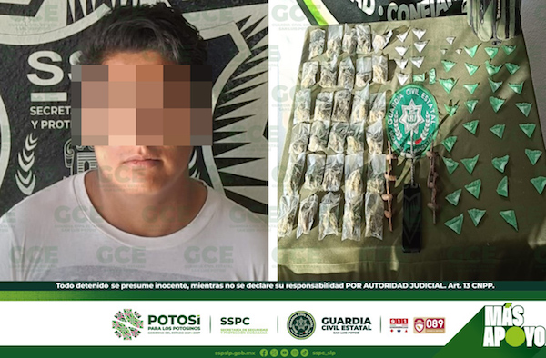 Vanegas, S.L.P.- Labores contundentes de la Guardia Civil Estatal (GCE), para el combate al narcomenudeo, derivaron en la detención de un presunto vendedor de narcóticos, a quien se le despojó de más de 70 dosis de diferentes drogas, tras los operativos de inteligencia en la zona centro de Vanegas.