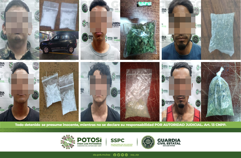 S.L.P.- Como resultado de diferentes operativos realizados en todo el territorio potosino y encaminados a inhibir actos ilícitos, oficiales de la Guardia Civil Estatal (GCE) detuvieron a 19 personas por la presunta posesión de estupefacientes.