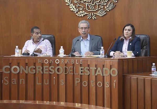 El diputado Crisógono Pérez López con el acompañamiento de los secretarios generales de la Sección 26 y 52 del SNTE Juan Carlos Bárcenas Ramírez y Elizabeth Bibiana Guerrero Milán, respectivamente, así como María del Rosario Villaseñor Oliver de la delegación del Tecnológico Regional, presentó la iniciativa para crear la Ley para la Protección de la Integridad, Derechos y Estabilidad Laboral del Personal Educativo en el Estado de San Luis Potosí.