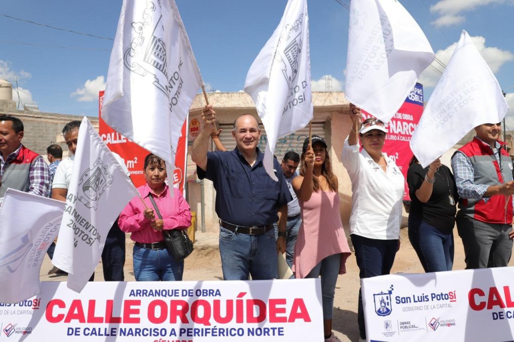 El Alcalde de San Luis Capital, Enrique Galindo Ceballos, junto con vecinas y vecinos, dio el banderazo de arranque de las nuevas obras que abarcarán más de 11 mil metros cuadrados de rehabilitación de las calles Narciso, en su segunda etapa, y la calle Orquídea, de las colonias Las Flores y Las Trancas, respectivamente.