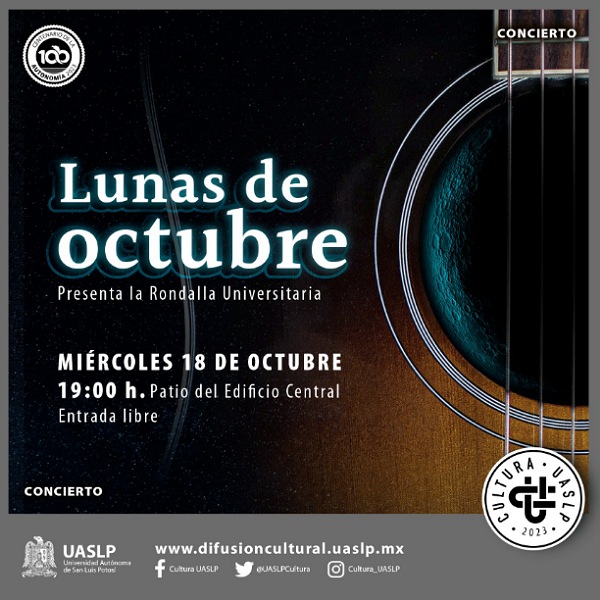 La Secretaría de Difusión Cultural de la Universidad Autónoma de San Luis Potosí, invita a la comunidad universitaria y público en general, para que asistan al concierto que ofrecerá la Rondalla Universitaria Potosina, “Lunas de Octubre”, que tendrá lugar el miércoles 18 de octubre de 2023, teniendo como escenario el Patio del Edificio Central en punto de las 19:00 Hrs.
