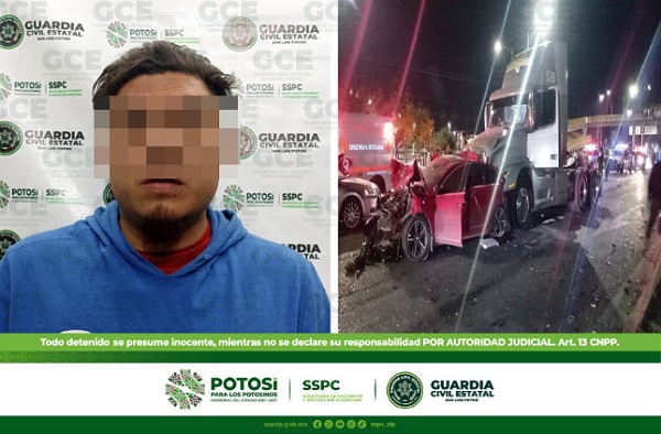 San Luis Potosí, S.L.P.- Un hombre fue detenido por agentes de Guardia Civil Estatal (GCE) luego de que presumiblemente ocasionara lesiones a tres personas, entre ellas una oficial de la corporación estatal, por impactar su unidad de carga en dos vehículos particulares.