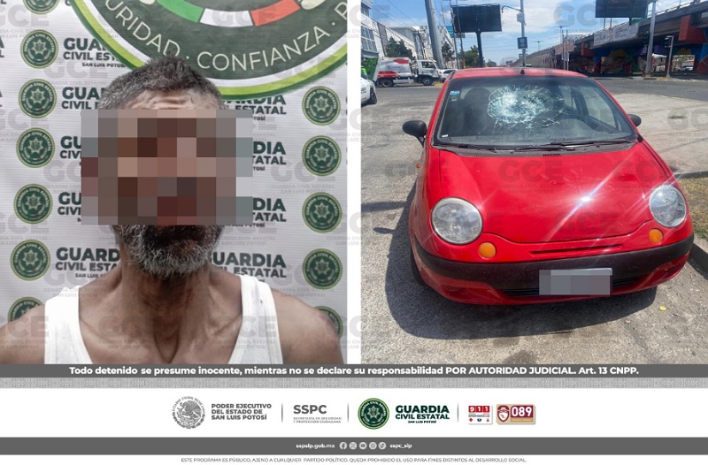 San Luis Potosí, S.L.P.- Una persona fue detenida por agentes de Guardia Civil Estatal, luego de que fuera denunciada por provocar presuntos daños a un vehículo; el detenido además fue sorprendido con dosis de enervantes en su poder.