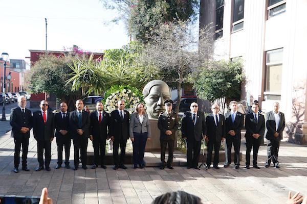 Encabezado por la diputada Sara Rocha Medina, presidenta de la Directiva del Congreso del Estado; los diputados Héctor Serrano Cortés, Cuahutli Badillo Moreno, y Emilio Rosas Montiel; el Secretario de Educación de Gobierno del Estado, Juan Carlos Torres Cedillo; el Gran Maestro de La Gran Logia Soberana e Independiente “El Potosí”, Horacio Sánchez; Brígido Puente Martínez, Secretario de Vinculación de la Confederación de Grandes Logias Regulares de los Estados Unidos Mexicanos