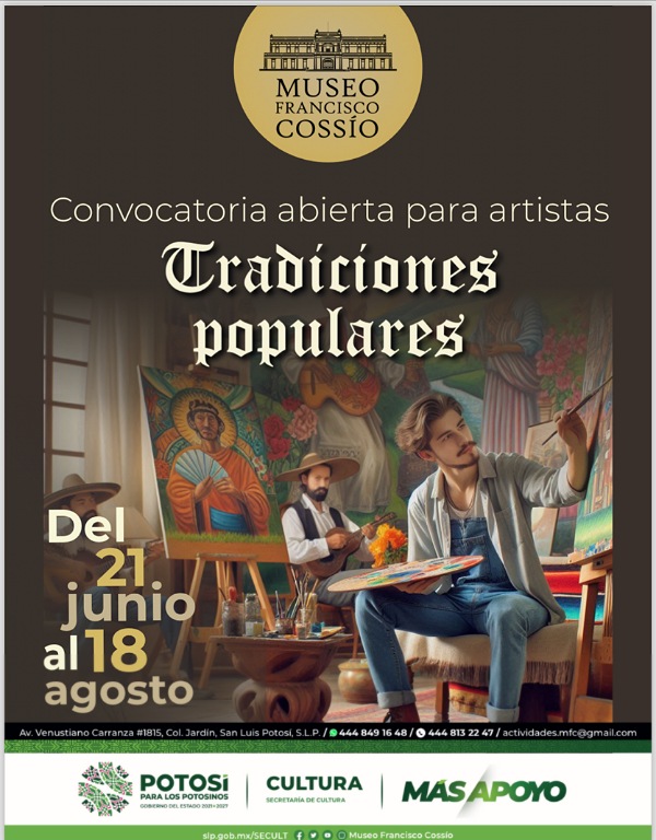 El Gobierno del Estado de San Luis Potosí, a través de la Secretaría de Cultura, invita a participar en la convocatoria abierta para artistas sobre “Tradiciones populares”, cuya selección derivará en una exposición colectiva que se presentará en la Sala Potosina del Museo Francisco Cossío.