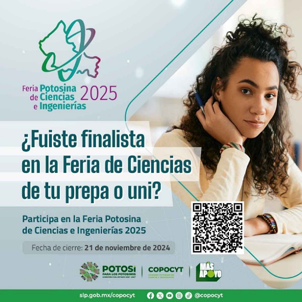 El Consejo Potosino de Ciencia y Tecnología (Copocyt), invita a las y los jóvenes de bachillerato y licenciatura a participar en la Feria Potosina de Ciencias e Ingenierías 2025, con el objetivo de impulsar la investigación científica, el desarrollo tecnológico y la innovación.