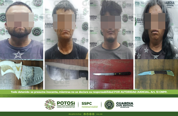 San Luis Potosí, S.L.P.- En diferentes acciones elementos de la Guardia Civil Estatal (GCE) detuvieron a cuatro hombres, que fueron sorprendidos deambulando por la zona metropolitana con armas punzocortantes.