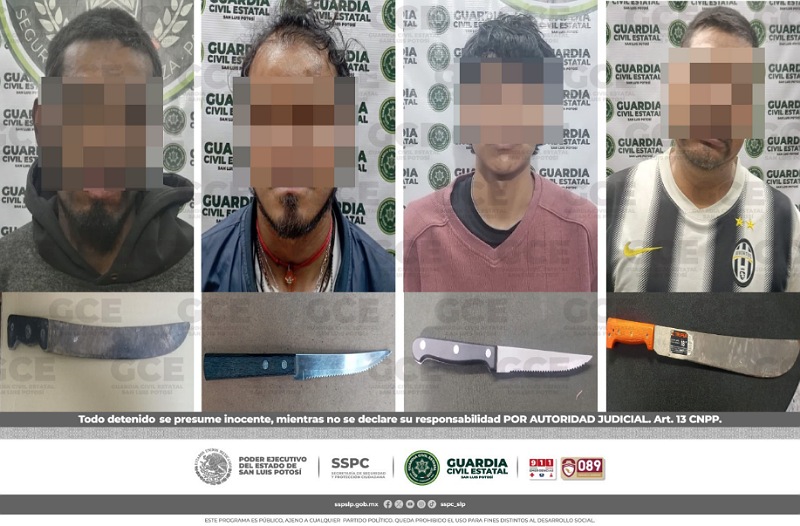 S.L.P.- Derivado de los operativos de seguridad y vigilancia, efectuados por elementos de la Guardia Civil Estatal, cuatro hombres resultaron detenidos por el probable delito de portación de armas prohibidas.
