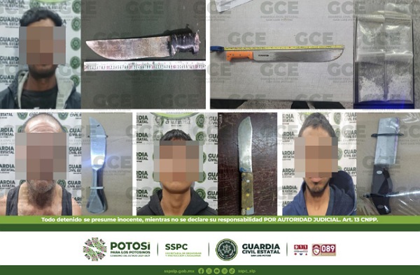 S.L.P.- Como resultado de los trabajos operativos, efectuados para inhibir actos delictivos, agentes de la Guardia Civil Estatal (GCE) detuvieron a cuatro hombres y a un menor de edad, por el presunto delito de posesión de armas blancas y droga.