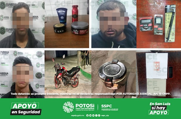 San Luis Potosí, S.L.P.- Mediante los llamados de auxilio que son atendidos por policías de la Guardia Civil Estatal (GCE), cuatro individuos fueron detenidos tras ser denunciados por el probable delito de robo de mercancía a diferentes establecimientos.