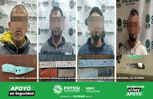 San Luis Potosí.- Elementos de la Guardia Civil Estatal aseguraron a cuatro personas en distintas acciones preventivas en el estado, luego de la implementación del Plan Integral de Seguridad.