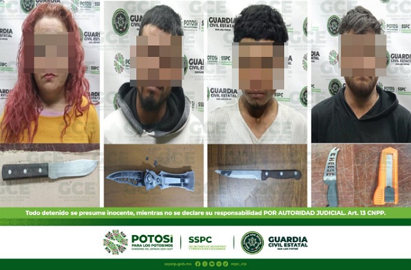 S.L.P.- Agentes de Guardia Civil Estatal (GCE) detuvieron a cuatro adultos y a una joven de 16 años de edad, por el probable delito de portación de armas punzocortantes. Los hechos ocurrieron durante los operativos en la zona metropolitana y en el municipio de Soledad de Graciano Sánchez.