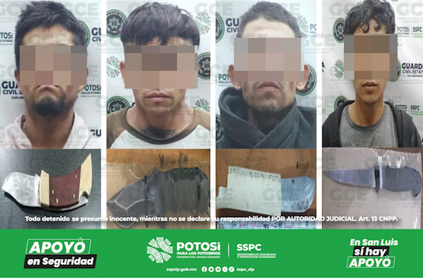 San Luis Potosí, S.L.P.- Patrullajes de seguridad y vigilancia llevados a cabo en la ciudad capital y en la zona conurbada, culminaron en la detención de cuatro masculinos, quienes fueron sorprendidos por la Guardia Civil Estatal (GCE) deambulando con armas punzocortantes.