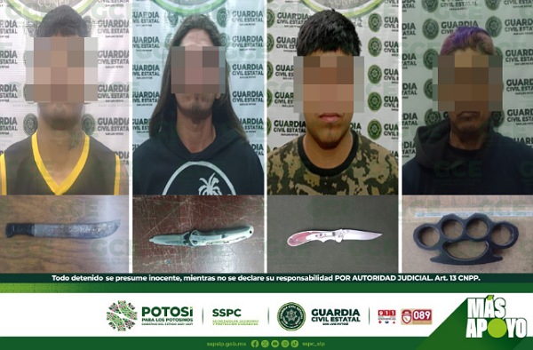 San Luis Potosí, S.L.P.- Derivado de los operativos de prevención y disuasión, efectuados por agentes de la Guardia Civil Estatal (GCE), cuatro personas resultaron detenidas, por la probable posesión de objetos prohibidos.