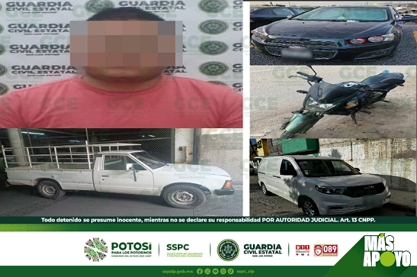 S.L.P.- Derivado de los operativos de seguridad, efectuados por policías de la Guardia Civil Estatal (GCE), cuatro unidades con reporte de robo fueron aseguradas, además de detener a un hombre, por el probable delito de tripulación de un vehículo en este estatus.