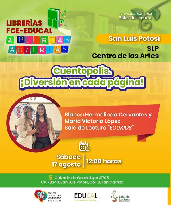 El Gobierno del Estado de San Luis Potosí, a través de la Secretaría de Cultura, invita al público en general a la presentación de “Cuentópolis ¡Diversión en cada página!” una actividad coordinada por las mediadoras de lectura Blanca Cervantes y María Victoria López, en la librería Educal, que se encuentra al interior del Centro de las Artes SLP, y que se llevará a cabo el sábado 17 de agosto a las 12:00 h, con entrada libre.