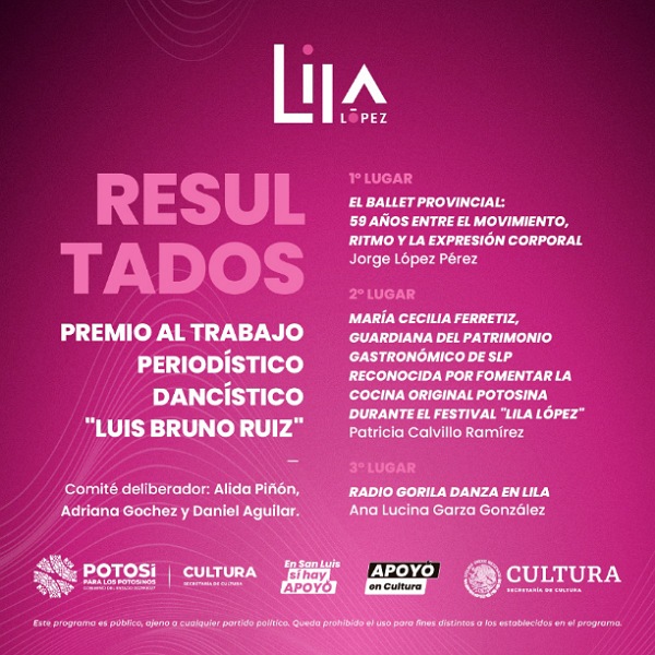 El primer lugar fue para el para el artículo “El ballet Provincial: 59 años entre el movimiento, ritmo y la expresión corporal” de Jorge López Pérez; segundo lugar para Patricia Calvillo Ramírez por “María Cecilia Ferretiz, guardiana del patrimonio gastronómico de San Luis Potosí, reconocida por fomentar la cocina original potosina durante el Festival Lila López”; y el tercer lugar fue para Ana Lucina Garza González por “Radio Gorila Danza en Lila”.