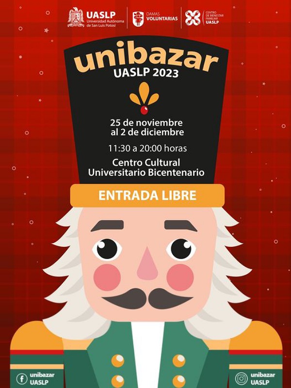 La Universidad Autónoma de San Luis Potosí a través del Comité de Damas Voluntarias de la Institución, invitan a la comunidad universitaria y a la sociedad en general al Unibazar UASLP 2023, mismo que se llevará a cabo de manera virtual del 25 de noviembre al 04 de diciembre y en formato presencial del 25 de noviembre al 02 de diciembre en las instalaciones del Centro Cultural Universitario Bicentenario (CC200) en un horario de 11:30 a 20:00 Hrs.