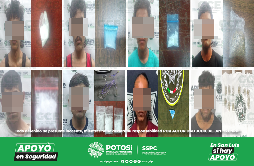 Derivado de los operativos de seguridad emitidos en la capital potosina, 11 personas fueron arrestadas: dos de ellos en el Barrio de Tlaxcala; uno de ellos se identificó Juan “N” de 20 años de edad, con una dosis de “cristal”; también a Rafael “N” de 26 años se le aseguró una bolsa con marihuana; sobre la colonia Santuario, Joel “N” de 39 años le aseguraron una dosis de “cristal”; otro de los hechos ocurrió en Los Filtros, Santiago de 19 años fue sorprendido con una dosis de marihuana.