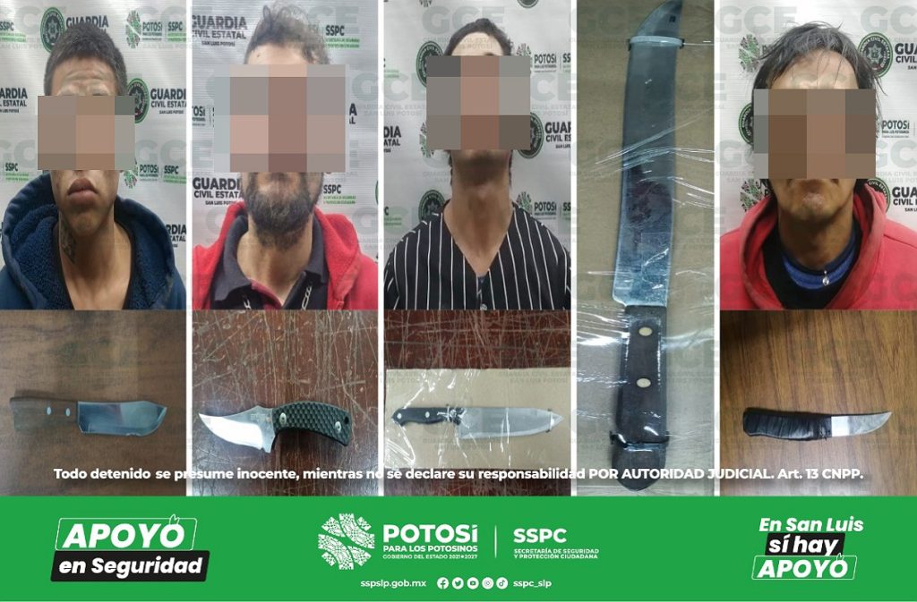 A su vez, en la colonia San Ángel Segunda Sección, se detuvo a Diana “N” de 20 años de edad, con un cuchillo de 24 centímetros; por su parte, en el municipio de Soledad de Graciano Sánchez, Carlos “N” de 28 años fue detenido con una navaja de 22 centímetros; en la Unidad Ponciano Arriaga, Alberto “N” de 49 años quedó detenido con un cuchillo de 21 centímetros; otro de los hechos fue en la colonia San Felipe, ahí un menor de 15 años fue sorprendido con un cuchillo de 32 centímetros; por último, en el municipio de El Naranjo, Gustavo “N” de 21 años quedó detenido con una navaja de 22 centímetros.